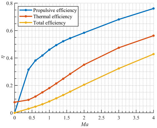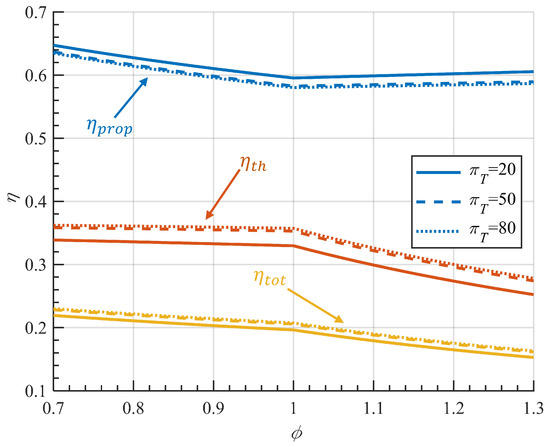 Variation in propulsive, thermal, and global efficiencies with the equivalence ratios.