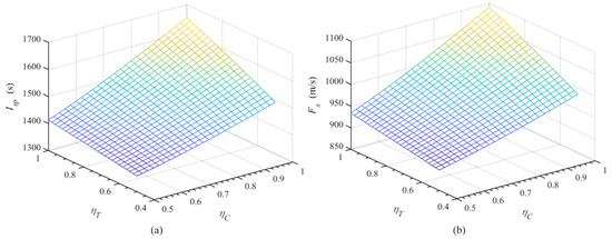 The (a) specific impulse and (b) specific thrust of the engine with different efficiencies of compressor and turboexpander.