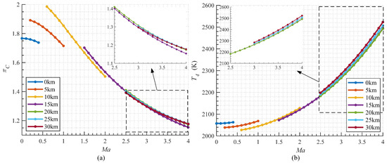 Variation of (a) total pressure ratio and (b) combustor outlet temperature in different flight conditions.