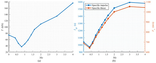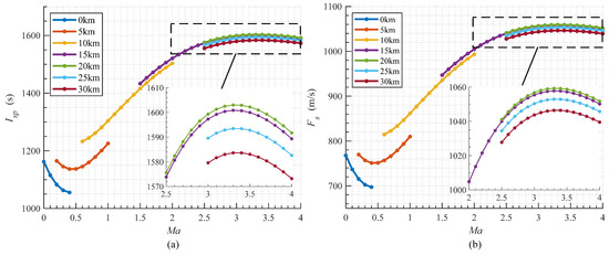 Variation in (a) specific impulse and (b) specific thrust with different Mach numbers.