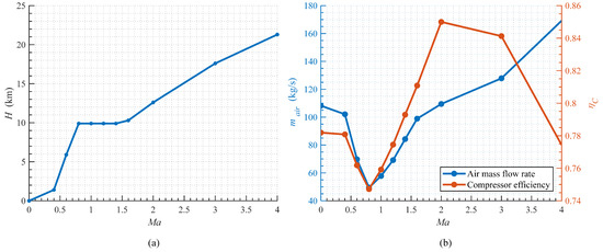 Since the engine needs to work in a wide range of speeds, the impact of the off-design point performance of components, like the intake and the compressor, cannot be ignored in the actual flight mission, but it is difficult to find the precise efficiencies of these components because they are largely dependent on their design. However, the approximate value or trend of the engine can be estimated through some assumptions. Assuming that the compressor operating line is similar to turbine engines, the flow capture coefficient and the compressor efficiency were estimated using Gasturb 12. The design point is still at Mach 2 and the flight trajectory is shown in Figure 13a. of the design point is 100 kg/s. The variation in the mass flow rate and the compressor efficiency in different Mach numbers is shown in Figure 13b. This paper assumes that the total pressure recovery coefficients of the combustor and the nozzle are constant, and the efficiency change in the pump and turboexpander are neglected.