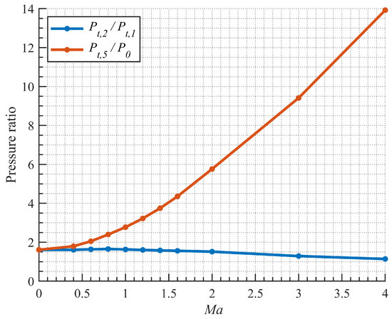 The intake can reduce the speed of the incoming airflow to satisfy the inlet requirement of the fan or compressor, and this process is accompanied by flow losses. The mass flow capture coefficient and the total pressure recovery coefficient are the main parameters of intake performance. The of supersonic intake is 0.97 to 0.99 at subsonic speed, and its value for the supersonic condition is given by the equation according to the US military standard MIL-E-5008B [31] shown in Equation (11):