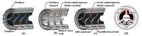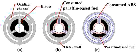 As shown in Figure 1, the swirl-radial-injection fuel grain was designed as a composite structure composed of an ABS substrate filled with a paraffin-based fuel. The ABS substrate had a hollow outer wall and three spiral blades that were integrated structures. This fuel grain induced uniform radial oxidizer injection based on the hollow swirl-radial-injector blades inserted at constant intervals. These blades rotated clockwise along the axial direction to induce a swirling flow of the oxidizer while the ABS acted as a low regression rate fuel and provided mechanical support for the fuel grain. The gaps between the blades were filled with a paraffin-based fuel. As shown in Figure 1a, during the operation of the engine, the oxidizer entered a channel located in the cross section of the hollow outer wall and flowed through the hollow blades, after which it was injected into the combustion chamber.