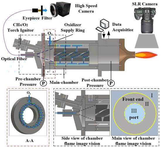 The experimental trials were performed using a lab-scale HRE with gaseous oxygen as the oxidizer. Figure 2 provides a diagram of the test setup, in which an oxygen/methane torch was employed to ignite the fuel grain. The gas supply system, pressure measurement system and nozzle dimensions in the present case were the same as those employed in our previous work []. The oxidizer entered the main chamber through an oxidizer supply ring that was connected to the fuel grain through a transition fitting and the mass flow rate of the oxidizer was varied between 7.45 and 30.68 g/s. The combustion chamber was purged with nitrogen after every firing test. A high-speed camera (iX Cameras, i-Speed 220, London, UK) was used to acquire images of the combustion chamber flame with an exposure time of 2 ms and a frame rate of 1 kHz. A 430 nm narrowband filter was employed to reduce the light intensity transmitted through the optical fiber []. The field of view of the chamber flame is indicated by the dotted line frame in the lower part of Figure 2. The images taken by the high-speed camera will be processed with pseudo-color, where the assigned colors represent different gray values only. Video of the exhaust plume was recorded using a Nikon SLR camera.