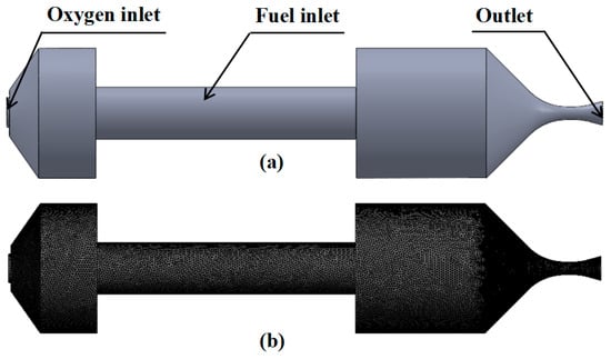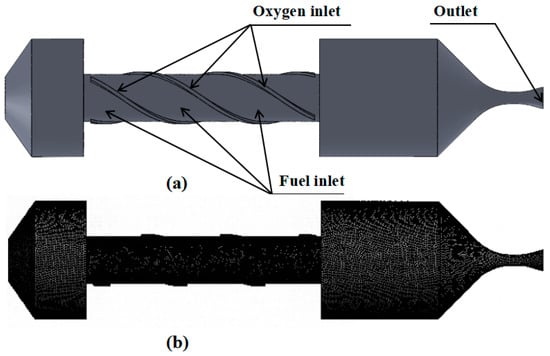 The ANSYS Fluent 2022 R2 software (ANSYS 2022 R2; Creator and the location: John Swanson, New York, NY, USA; Software Sourced: Livermore Software Technology Company, Canonburg, PA, USA) program was used to perform combustion simulations. The computational domains for both engine types are presented in Figure 3a and Figure 4a. All walls in the fluid domain were defined as adiabatic. The 3D Navier-Stokes formula was employed to perform flow simulations and the turbulent flow field was simulated using the SST k-ω turbulent model. The energy equation and species transport equation were coupled. The eddy-dissipation concept model was employed to simulate the combustion process. This model is commonly used to account for interactions between the flame chemistry dynamics and turbulence. The oxidizer and fuel inlets were both defined as mass flow inlets while the outlet was a pressure outlet. Ethylene (C2H4) was employed as a surrogate for the present paraffin-based fuel because paraffin is a mixture of saturated alkanes and undergoes combustion in a manner similar to that of ethylene []. A 10-step global C2H4 reaction mechanism was applied in these simulations []. The species associated with the oxygen inlet, fuel inlet and outlet in all cases were set to O2, C2H4 and air, respectively, with temperatures of 300, 1000 and 300 K, respectively. The mass flow rates and pressures for the two cases are summarized in Table 1. In this manner, the combustion flow field, temperature and species distribution were all simulated. Although the present numerical simulation is based on a simplified model, it accurately reflects the combustion characteristics of the two different fuel grains and allows for the additional optimization of the engine structure.