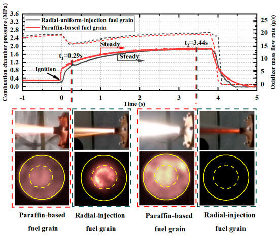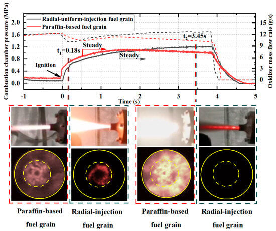 Data and images from trials using an oxidizer mass flow rate of 19.05 g/s are shown in Figure 6, from which it is evident that both grain types exhibited similar phenomena. Here, both grain types exhibit a bright plume during the ignition stage. The chamber flame images show that the paraffin-based fuel grain generated a flame that filled the entire field of view, while the swirl-radial-injection fuel grain produced a flame only in the port of the fuel grain. The former grain also showed a bright plume during the steady-state stage while that of the latter grain was smoky. Once more, the chamber flame associated with the paraffin-based fuel grain filled the entire field of view while images of the swirl-radial-injection fuel grain could not be acquired. Although the high-speed camera was unable to focus properly during the combustion of the paraffin-based fuel grains, possibly because of vibrations of the engine, this lack of focus did not affect our ability to assess the flame distribution.