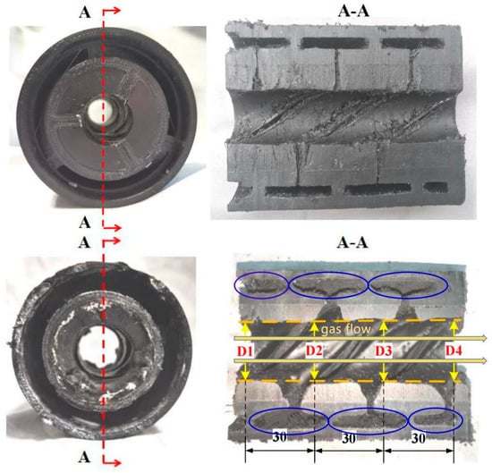 Erosion was also observed along the oxidizer flow channel at the outer wall, as indicated by the regions in the blue circles in Figure 5. This effect may have been caused by a low oxidizer flow velocity that allowed the flame to migrate into the oxidizer channels along the blades, as a consequence of the countercurrent flame propagation mechanism in this grain [,,,]. This phenomenon was expected to complicate subsequent evaluation of the fuel regression rate.