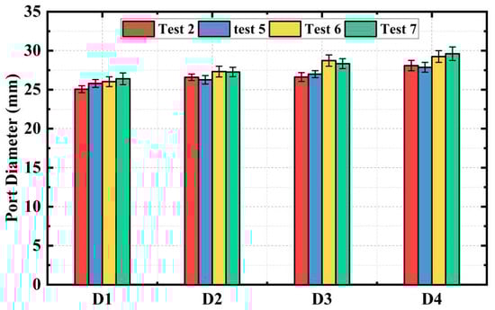 As shown in Figure 7, swirl-radial-injection fuel grains before and after the firing tests were cut along the axial center line and specimens were removed. The port diameters were subsequently measured at positions that were 0, 30, 60 and 90 mm from the front end, referred to herein as D1, D2, D3 and D4, respectively. The port diameter distributions along the axial directions of fuel grains following several tests are summarized in Figure 8. It is apparent from these data that there was no erosion at the front end of the fuel grain, in agreement with the images presented in Section 3.1, showing that the flame was only present in the port. This effect helped to provide thermal protection to the pre-chamber. It is also apparent from this figure that there were only slight variations in diameter along the axis direction. It should also be noted that the port diameter at the rear of the grain was slightly larger, in contrast to the results typically obtained from fuel grains using conventional fore-end injection. In such cases, the port diameter at the rear of the fuel grain is typically less than that at the front end [,,].