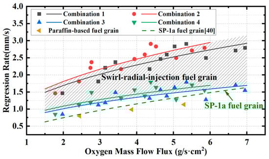 Considering the oxidizer channel ablation phenomenon that occurred during the combustion of the present swirl-radial-injection fuel grains (see Section 3.2), calculating the regression rate solely based on the mass consumed during firing would have led to a large error. Hence, in this work, two alternative approaches to determining the regression rate were evaluated. In Method 1, only the mass lost based on the combustion of the paraffin-based fuel and the three blades was used in the calculation of equivalent port diameter while, in Method 2, the entire fuel grain mass loss was considered. These methods are explained in Figure 9b,c. The regions shaded in red in Figure 9 indicate the paraffin-based fuel was consumed while the blue shaded areas represent the ABS that was consumed. Two approaches were also used to ascertain the oxidizer mass flux values. In Method 1, the port diameter was measured at different axial positions after firing and these values were then averaged, while in Method 2, the equivalent port diameter was calculated based on the mass loss of the paraffin-based fuel and three blades. These calculations are described in detail in Appendix A. The regression rate results calculated using each of these methods had two sets of corresponding oxidizer mass flux results. Thus, four combinations of regression rate and oxidizer flux values were obtained and are summarized in Table 4. Four fitting lines to these data are plotted in Figure 10, in which the actual regression rates are distributed in the shaded regions. Here, the results of the paraffin-based fuel grains with fore-end injection are included as a baseline while a fitting line representing data obtained from the SP-1a fuel grain developed by Stanford University [] is used as a reference. The present results demonstrate that, compared with the paraffin-based fuel grain, the regression rates of the swirl-radial-injection fuel grains were much improved.