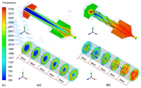 Figure 11 presents the temperature contours at cross-sections along the main view direction and in different axial directions for two cases. In case 1, which corresponded to the fuel grain using fore-end injection, the oxygen entered the combustion chamber at the front end of the engine and reacted with the fuel to generate a typical HRE diffusion flame above the inner surface of the grain []. The simulated temperature in the pre-chamber was found to be relatively high, with a value of approximately 3700 K. Moving along the axis of the grain, oxygen was gradually consumed such that the flame slowly became thicker and moved away from the inner surface of the grain. Some residual oxygen evidently remained in the post-chamber and the flame was only present around the oxidizer flow.