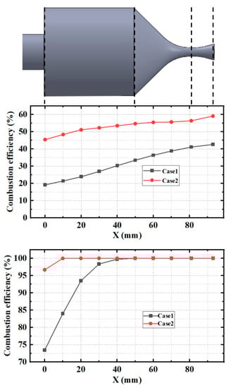 The combustion efficiency values for 10 cross-sections ranging from the rear end of the fuel grain to the nozzle outlet were calculated, as shown in Figure 12. The data in the upper and lower plots in this figure were obtained using Equations (1) and (2), respectively. Here, the four dotted lines correspond to the rear of the fuel grain, the rear of the post-chamber section and the nozzle throat and outlet. The combustion efficiency as defined by Equation (1) for case 1 increased from 19.18% to 42.61%, going from the base of the fuel grain to the nozzle outlet, whereas for case 2, these values went from 45.41% to 59.07%. The combustion efficiency at the outlet of the nozzle was increased by 39.83% while the combustion efficiency at the rear of the fuel grain was 45.01% of the value at the outlet for case 1. For case 2, this value was 76.87%. These data are ascribed to the more complete combustion achieved at the base of the fuel grain with the new design. The combustion efficiency values defined by Equation (2) also exhibited the same trend. The combustion efficiencies at the rear of the fuel grain were determined to be 73.42% and 96.67%, respectively, for cases 1 and 2. Although the final combustion efficiency reached 100%, this occurred at approximately x = 40 and 10 mm for cases 1 and 2, respectively.
