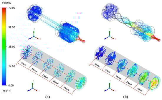 A 3D streamline diagram and several streamlines at different axial position cross-sections for case 1 and 2 are presented in Figure 13. It is obvious that rotational flow occurred at the center of the fuel grain in response to a viscous shear force and induction by the helical blades []. This flow promoted fuel/oxidizer mixing and so improved the combustion efficiency. The swirl flowing path also enhanced the shear action of the gas on the burning surface of the fuel grain, which in turn improved the regression rate.