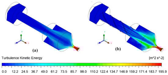 The kinetic energy of turbulence reflects the intensity of the turbulence []. As shown in Figure 14, the kinetic energy values were minimal at the pre-chamber and the front end of the fuel grain. However, at axial positions close to the nozzle, the combustion reaction was significantly increased and so the turbulence kinetic energy was greater. Even so, the kinetic energy in the swirl-radial-injection engine was higher than that in the fore-end injection engine, indicating enhanced turbulence intensity in the former.
