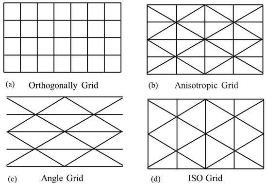 Four reinforcement types: (a) Orthogonally Grid, (b) Anisotropic Grid, (c) Angle Grid, (d) ISO Grid.