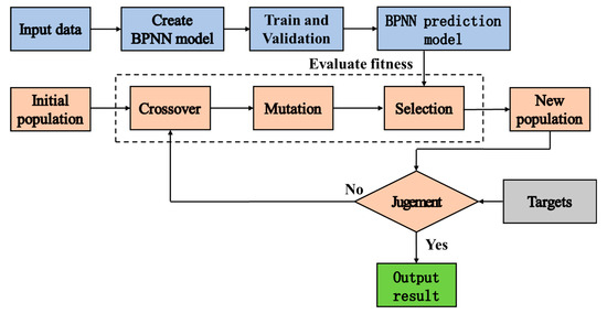 The process of inverse design for thin-walled reinforced structures is shown in Figure 4. This method combines BP neural networks and genetic algorithms and encompasses several steps. Initially, a model database is established, where the input data consists of design parameters, and the output data represents the design objectives (the buckling load). Subsequently, a BP neural network is employed to construct a mapping model, facilitating the transformation of input parameters into output data. Through the training of the BP neural network, the interconnections between neurons, including the weights and thresholds, are adjusted with utmost precision to minimize the discrepancy between the actual output data and the intended target output data.