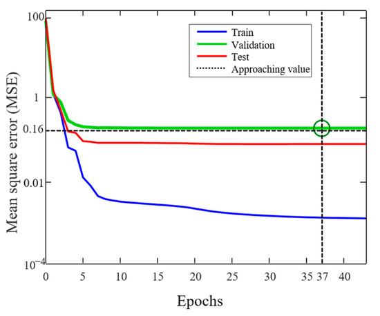 The convergence of the neural network is shown in Figure 6, and the optimal solution is obtained after the 37th epoch. The regression function is shown in Figure 7. The determination coefficient values in the training set verification set test set and all samples are 0.98, 0.99, 0.99 and 0.98, respectively, which indicates that the network has a good performance in these sets.