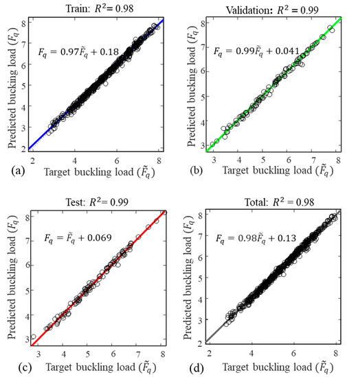 Regression analysis between the predicted and target buckling loads: (a) training data set, (b) validation data set, (c) test data set, and (d) overall data set.