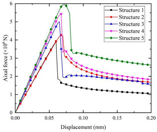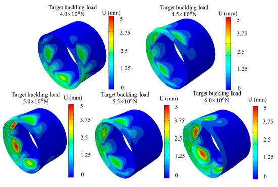 In order to further ensure the accuracy of the inverse design, the structure obtained by the inverse design is geometrically reconstructed and verified by the finite element analysis. The distributions of the obtained displacements are shown in Figure 8. The load curve of each structure is shown in Figure 9.