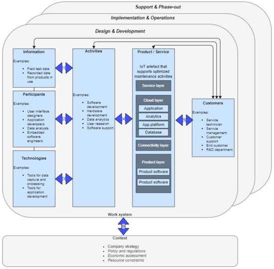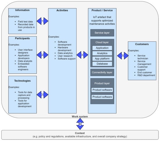 - Product/Service: product(s) and/or service(s) “consist of information, physical things, and/or actions produced by a work system for the benefit and use of its customers” [33]. The integrated framework extends this element by introducing the layered technology stack framework, including a service layer, cloud layer, connectivity layer, and product layer;