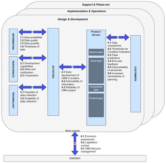 In this section, the adapted integrated framework is applied to identify the limitations and challenges facing CBM. Furthermore, policy implications and opportunities for introducing and implementing CBM in aviation are considered. To ‘instantiate’ the framework, findings from various panel discussions, expert interviews, and stakeholder workshops held at the 1st International Conference for Condition-Based Maintenance in Aerospace (ICCBMA) held at Delft, The Netherlands, on 24–25 May 2022 (https://cbmacademy.eu/, accessed on 14 July 2023), and the resulting public deliverable D9.4 “Strategic action plan for future CBM adoption” of the Horizon 2020 Real-time Condition-Based Maintenance for Adaptive Aircraft Maintenance Planning (ReMAP) project have been adopted. Both the conference and the deliverable included input from all categories of primary stakeholders in the aviation ecosystem, including manufacturers/primes, vendors, airlines, MROs, aviation authorities, and academia. As such, a multi-stakeholder perspective on CBM in aviation is provided.