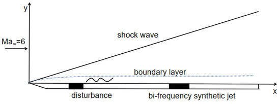 The parameters of the incoming flow described in this paper are consistent with the parameters of the FD-07 wind tunnel at the China Academy of Aerospace Aerodynamics. The Mach number of the incoming flow was 6, the temperature was 54.9 K, and the unit Reynolds number was 1.0 × 107/m. Adiabatic wall conditions were used to simulate the boundary layer of an Ma 6 plate. The model was a sharp plate with a length of 200 mm, as shown in Figure 1. Unsteady blowing and suction disturbance were applied at x = (10 mm, 15 mm). The disturbance form is as follows: