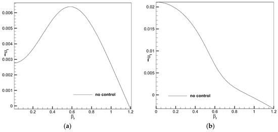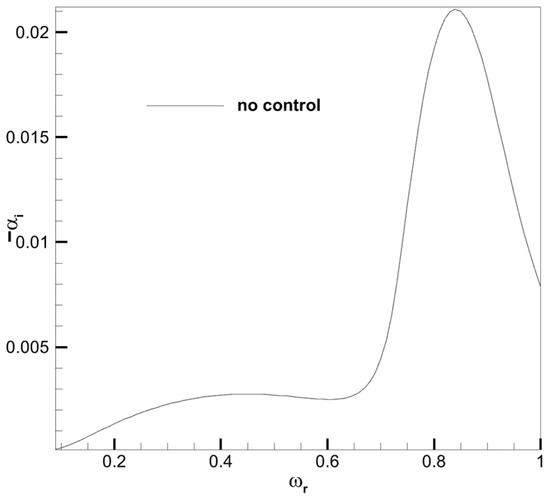 Figure 10 illustrates the first- and second-mode growth rates varying with spanwise wave number βr in the uncontrolled state. As βr increased, the growth rate of the first mode gradually rose and reached its peak at approximately 0.0062, whereas the second-mode growth rate gradually decreased. This indicates that the most unstable first mode is the three-dimensional unstable wave, and the most unstable second mode is the two-dimensional wave.