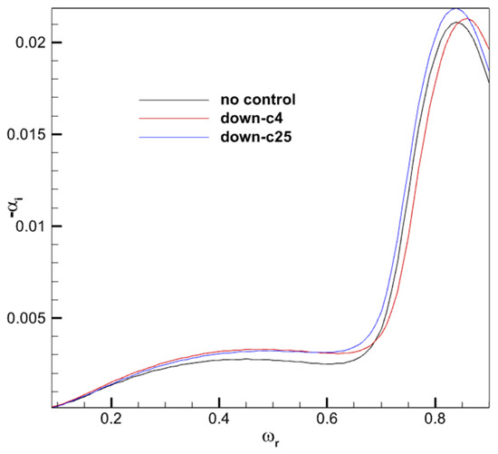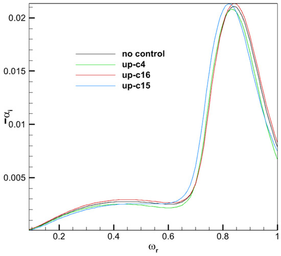 Figure 3 shows the growth rate −αi varying with frequency ωr in the uncontrolled case. It is worth noting that the actual frequency is expressed as ωr × 141.79 kHz. The figure displays two prominent peaks: the first mode (around 63.8 kHz) with a maximum growth rate of 0.00276, and the second mode (around 119.10 kHz) with a higher maximum growth rate of 0.02108. Notably, the second mode emerged as the dominant unstable mode within the hypersonic boundary layer.
