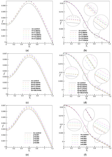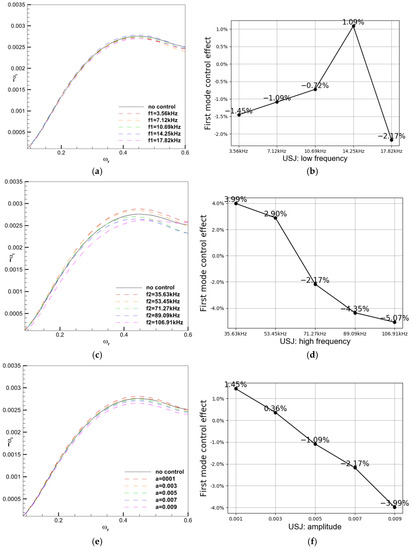 One-way ANOVA was conducted to analyze the first-mode growth rates as the frequency changed, controlled by the low frequency, high frequency and amplitude of the USJ, as shown in Figure 5. For this section, the spanwise wave number βr was fixed at βr = 0. For the first mode, when the low frequency, f1, was too low or too high, the growth rate was lower compared to the uncontrolled state. Additionally, as f2 increased and a became larger, the first-mode growth rate decreased. These observations reveal enhanced flow stability and a delay in the transition process.