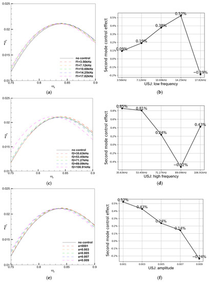Figure 6 shows the one-way ANOVA results for the second-mode growth rates varying with frequency. For the second mode, only when f1 = 17.82 kHz, f2 = 89.9 kHz, a = 0.009, was the growth rate lower than the uncontrolled state, which increased the stability of flow.