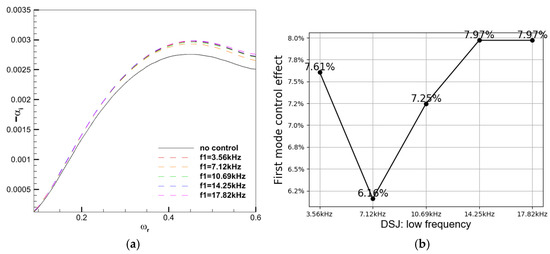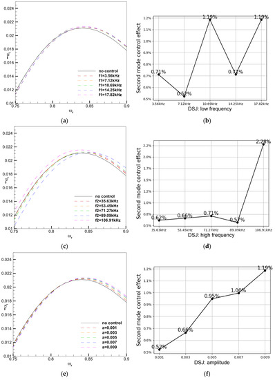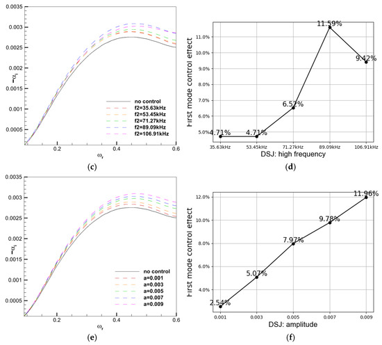 One-way ANOVA was conducted to examine the growth rates of the first mode varying with frequency, controlled by the low frequency, high frequency, and amplitude of the DSJ, as shown in Figure 8. These figures illustrate the control mechanism of the DSJ on the first mode.
