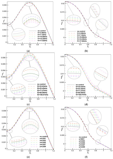 At the five levels of f1, the growth rate was approximately 7% higher compared to the uncontrolled state. As the f2 increased, the growth rate of the first mode also rose until it reached f2 = 89.89 kHz. At this point, the promotion effect on the first mode reached its peak at 11.59%, resulting in an earlier transition. Moreover, a larger value of a corresponded to a higher growth rate of the first mode, which also led to increased flow instability.