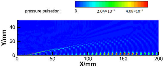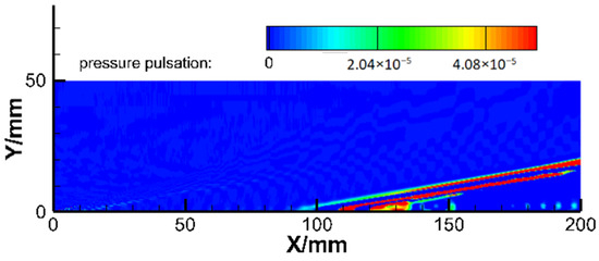 Figure 15 displays the pressure pulsation diagram of the flow field with promoted transition, specifically case 19 of the DSJ. It is evident that beyond the wave system, the twin-cell structure of pressure pulsation further intensified until it merged with the wave system structure, indicating increased flow instability and transition promotion.