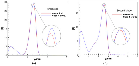 Figure 16 shows the disturbance temperature eigenfunction of case 4 of the USJ, which exhibited the best transition suppression effect. It can be observed that although case 4 has a suppressing effect on both the first and second modes, the peak values of the disturbance temperature eigenfunctions for both modes are larger compared to the uncontrolled state. The suppression effect on the first mode was better than that on the second mode, and the increase in the peak value of the temperature eigenfunction was also greater for the first mode compared to the second mode. This phenomenon has also been observed in the study by Liu [29] on synthetic jets and wall blowing/suction for transition control. This finding suggests that the suppression of unstable modes may be achieved through temperature modification. Arthur Poulain [36] pointed out that the control mechanism of wall blowing/suction for transition is its modification of the momentum in the boundary layer. The temperature modification discovered in this study may be related to the velocity–temperature coupling mechanism in hypersonic flows.