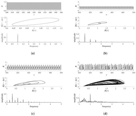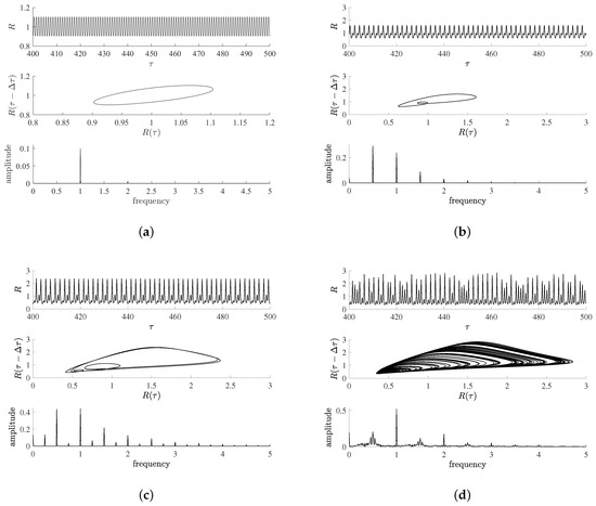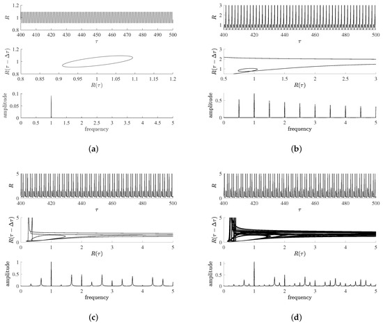 At the point , a period-doubling bifurcation occurs, where the limit cycle becomes self-intersected and the period of the cycle doubles, as shown in Figure 2b. As the attractor becomes geometrically different, the final state of the system is qualitatively different from the case, and a bifurcation occurs. With the further increasing of the , there will be a series of period-doubling to period-4 (), period-8, period- and finally to chaos (), as shown in Figure 2c,d.