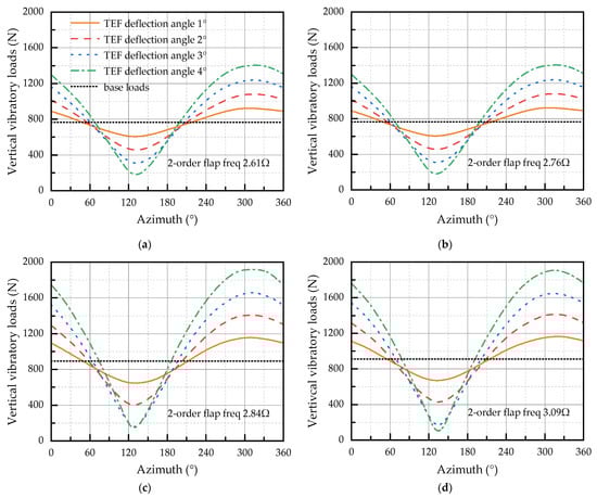 It is evident in Figure 6 that the TEF optimal phase of vibration reduction for the rotor with different second-order flapping frequencies is in the range from 190° to 220°. Based on the phase-sweep results of the rotor with different flapping dynamic characteristics, the rotor vibratory loads for different deflection angles at the optimal phase are shown in Figure 7. It can be seen that for a four-bladed rotor, if the TEFs deflect at the frequency of 4 Ω, the control effect of the vertical vibratory loads on the hub is enhanced as the second-order flapping natural frequency of the blades approaches 4 Ω.