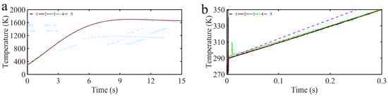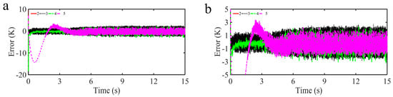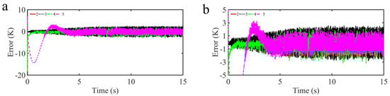 Figure 7a shows the temperature response results of our proposed control strategy, the TDE-GTSMC-MFIPIDC strategy, the TDE-MFIPIDC strategy and the traditional PID control strategy, and their partial enlarged curves are given in Figure 7b. Meanwhile, the tracking error curves and their partial enlarged curves for four control strategies are also given in Figure 8 to further demonstrate the control performance. As depicted in Figure 7a, effective target temperature curve tracking performance has been obtained with all four control strategies. According to the analysis of Figure 7b and Figure 8, we can see that the TDE-GTSMC-MFIPIDC strategy and the TDE-ANNGFOFTSMC-MFIPIDC strategy converge and stabilize almost at the initial moment, TDE-MFIPIDC strategy holds convergence at approximately 0.5 s, while the traditional PID control strategy holds convergence at approximately 4 s. Such a fast convergence speed is attributed to the fact that the TDE-MFIPIDC strategy, as the main controller, keeps convergence in a short time and the sliding mode control, as the auxiliary controller, further accelerates convergence in a short time. It can be seen from Figure 8 that the chattering amplitude of the TDE-GTSMC-MFIPIDC strategy, the TDE-MFIPIDC strategy and PID is more obvious at close to 2 K, while the chattering amplitude of the TDE-ANNGFOFTSMC-MFIPIDC strategy is only approximately 0.2 K, which is due to the role of FO and ANN in the designed sliding mode control strategy to ensure the control accuracy while suppressing the chattering phenomenon.