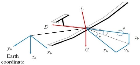 where x, y are the position of the SUAV; z is the altitude; V is the speed; g is the gravitational acceleration; CL is the lift coefficient; and ψ, γ, ϕ are the heading angle, flight path angle and bank angle, respectively (see Figure 2). In this work, the thrust is zero during the gliding phase, and the flight path angle can be calculated in Section 4 depending on the force balance analysis of the drag and weight of the SUAV.