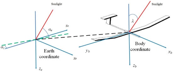 Next, the solar incident angle on the surface of the wing is calculated in order to obtain the solar irradiance on the wing of the SUAV. It describes the angle between the sunlight and the solar panel on the airfoil of the SUAV. An earth coordinate frame and a body-fixed coordinate frame are built (see Figure 3), in which E, N, D point to the orientations of east, north and ground, respectively. We define the unit vector of the sunlight Vp under the earth coordinate frame: