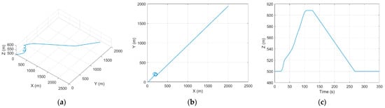 The SUAV trajectory for soaring and gliding process: (a) 3D space, (b) xy plane, (c) z plane (altitude).