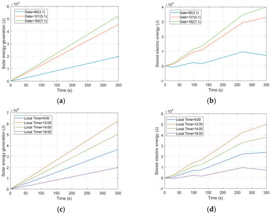 SUAV energy variation through thermal under V = 10 m/s: (a) solar energy generation at 16:00 on different dates, (b) stored electric energy at 16:00 on different dates, (c) solar energy generation on May 1st at different local times, (d) stored electric energy on May 1st at different local times.
