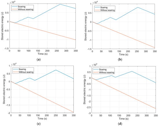 The SUAV’s stored electric energy with or without soaring under different velocities at 16:00 on May 1st: (a) V = 10 m/s, (b) V = 11 m/s, (c) V = 12 m/s, (d) V = 13 m/s.