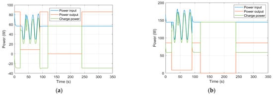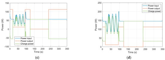 The SUAV input, output and charge power under different velocities and at different local times on May 1st: (a) V = 10 m/s, local time = 16:00; (b) V = 10 m/s, local time = 14:00; (c) V = 12 m/s, local time = 16:00; (d) V = 12 m/s, local time = 14:00.