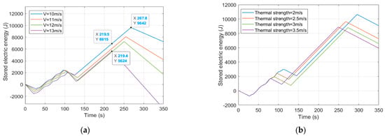 The SUAV’s stored electric energy profile at 16:00 on May 1st under different (a) velocities and (b) strengths.