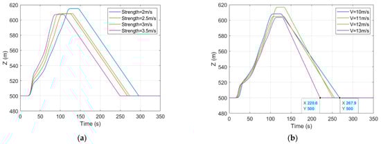 The SUAV altitude profile under different strengths (a) and velocities (b).