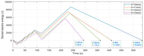 The stored electric energy increases during the soaring and gliding processes, whereas it gradually decreases when the SUAV switches to cruise mode. Figure 11 shows the electric energy profile of the SUAV during the soaring, gliding and cruise phases with one thermal. It is clear that the SUAV’s stored electric energy under 10 m/s decreases to zero at 537 s, and the corresponding values under diverse SUAV velocities are different.