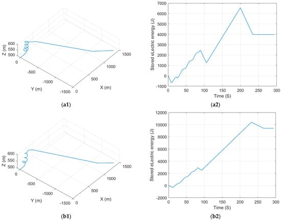 SUAV flight trajectory and electric energy: (a1,a2) time constraint 230 s, V = 13 m/s, thermal strength = 2.5 m/s; (b1,b2) time constraint 260 s, V = 10 m/s, thermal strength = 2.5 m/s; (c1,c2) time constraint 230 s, V = 10.8 m/s, thermal strength = 3.5 m/s.