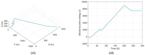 Figure 12 presents the flight trajectory and electric energy profiles under different thermal strengths and time constraints. The SUAV’s velocity in each condition is calculated based on the time constraint for the maximum electric energy. Comparing Figure 12(a1,a2) with Figure 12(b1,b2), it can be concluded that for the same thermal strength, a shorter time constraint will cause the SUAV to reach its destination at a faster speed and spend more and more energy. Furthermore, comparing Figure 12(a1,a2) with Figure 12(c1,c2) shows that slower thermal strengths will lead to faster SUAV velocity under the same time constraints. That is because a slower thermal strength leads to an increase in soaring time, which in turn shortens the gliding and soaring time costs.