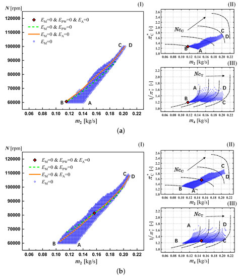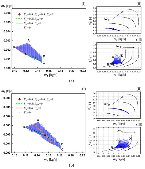 Taking fuel mass flow as the iterative variable , the feasible state points of the engine under different constraints are shown in Figure 14. Similar to Figure 13, the mass flow conservation constraint limits the feasible state points to the area bounded by the A-B-C-D zone. In this region, the D-C boundary is limited by the maximum mass flow of the constant rotation speed line in the compressor’s map, just as shown in the Figure 14a,b. At the A-D boundary of the feasible region, the turbine works at the maximum corrected mass flow. At the BC boundary, the turbine works with a smaller expansion ratio at approximately 1.2. When the engine works at low rotation speed, the turbine is at the B-C boundary with a low mass flow. While at high rotation speed, the turbine approaches the choke boundary A-D. In contrast, the compressor is always in the peak efficiency area at different co-working points of the engine.