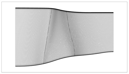 The inlet boundary, exit boundary, solid wall boundary, and periodic boundary make up the boundaries of the Rotor 67 rotor single–pass computational domain. The inlet boundary is set to subsonic axial inlet, given a total temperature of 288.15 K, a total pressure of 101,325 Pa, and an inverse static pressure, and the lateral deflection pulsation velocity in the turbulence model is set to 0. The lateral deflection pulsation velocity of the turbulence model is also extrapolated, and the outflow boundary is set to a specified mean static pressure, density, and velocity. The relative velocity is provided as 0, the static pressure and density are extrapolated, the hub and blades in the solid wall boundary are set to adiabatic no–slip in the rotating coordinate system, and the magazine is set to adiabatic no–slip in the stationary coordinate system. The single-channel computational domain grid is periodically matched, and linear interpolation is used on the rotating periodic boundary to obtain the parameters on the boundary. See Appendix A for more details on boundary conditions.
