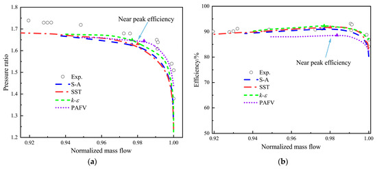 Performance curves of NASA Rotor 67 calculated by four turbulence models versus experimental values. (a) Pressure ratio (b) efficiency.